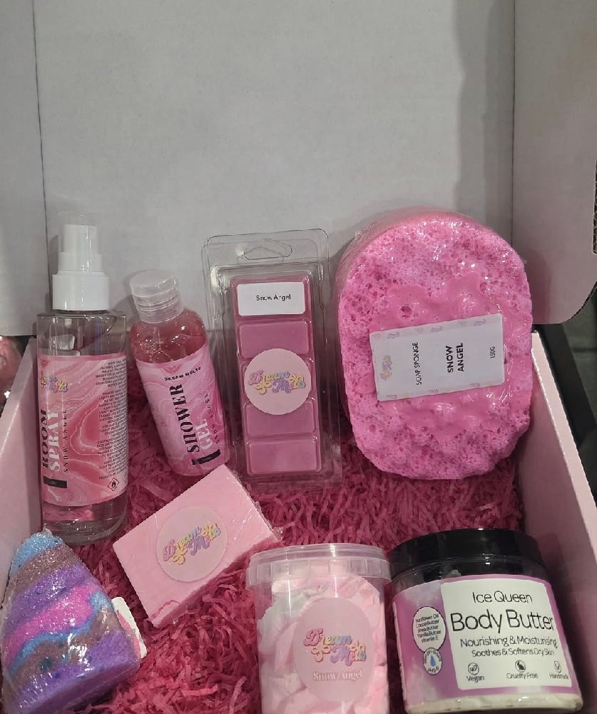 Pink gift box filled with all snow angel inspired products.